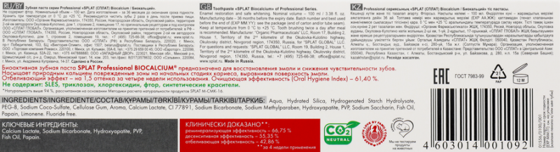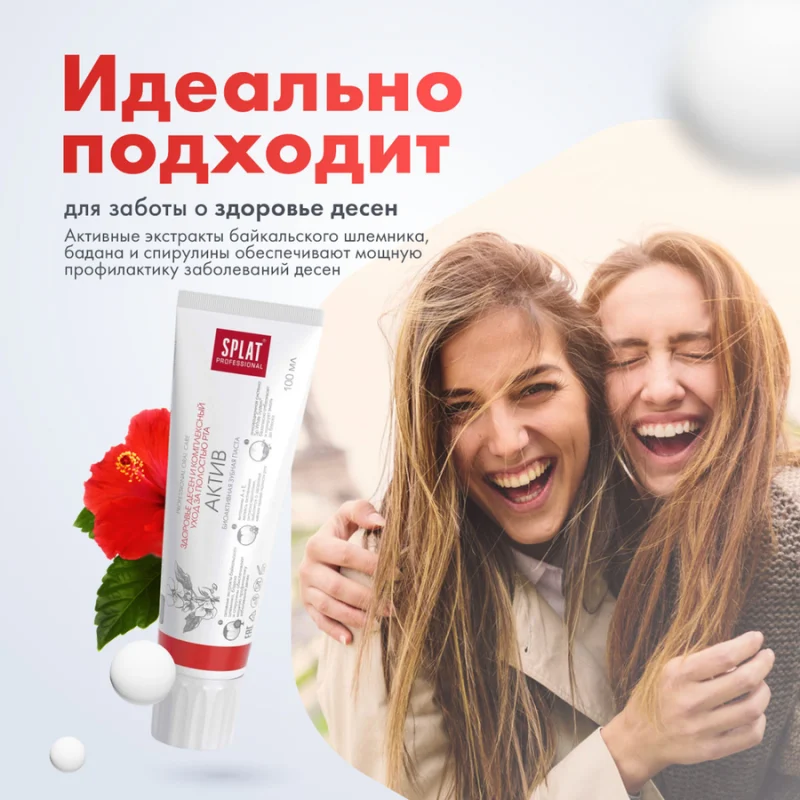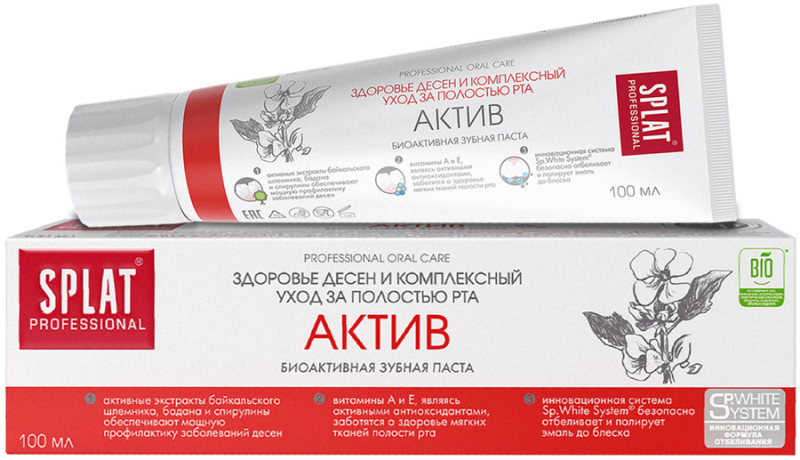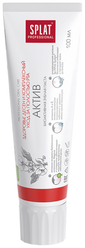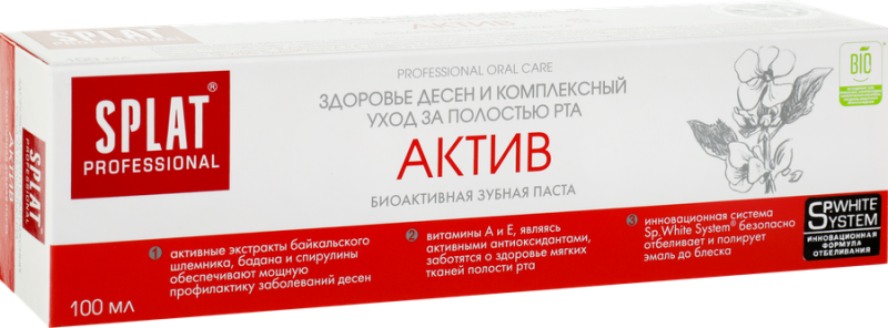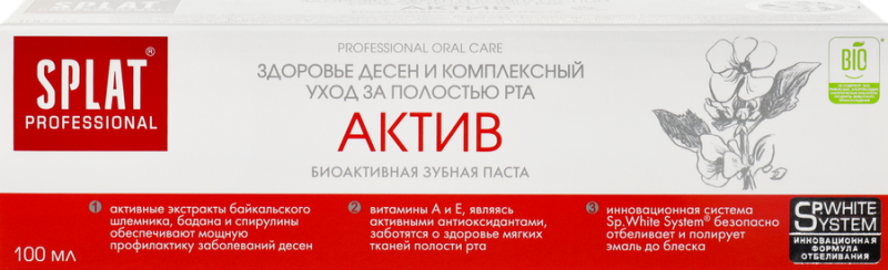 Зубная паста SPLAT «Актив» лечебно-профилактическая с активными экстрактами байкальского шлемника, бадана и спирулины обладает мощным кровоостанавливающим и противовоспалительным действием. Глицерофосфат кальция – один из наиболее эффективных источников ионов кальция – способствует укреплению эмали, активирует процессы реминерализации. Фторид-ионы оказывают воздействие на бактерии, вызывающие кариес. Витамины A и E, входящие в состав пасты, обладают выраженными антиоксидантными свойствами. Инновационная система Sp. White System бережно очищает и полирует эмаль до блеска. Паста не содержит синтетических красителей. Имеет гелевую текстуру и темный цвет.