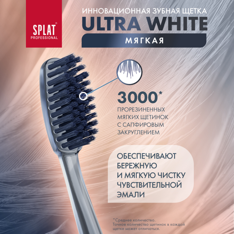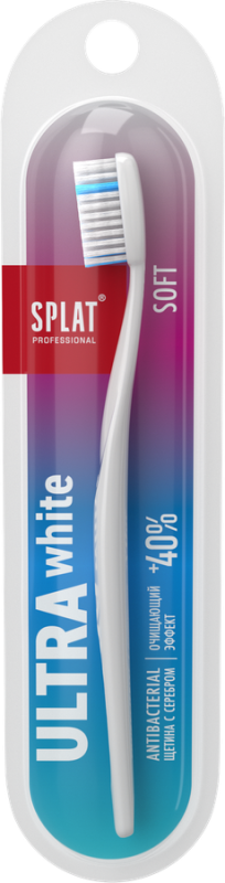 Зубная щетка Professional Ultra White Soft SPLAT предназначена для интенсивного отбеливания. Ее щетина имеет сапфировое округление кончиков, а также содержит ионы серебра. Щетинки с резиновым покрытием очищают поверхность зубов от налета на 40% эффективнее обычной щетины.
