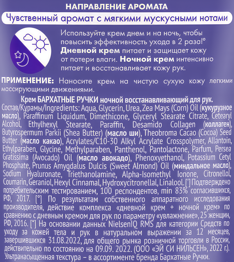 Ночной крем для рук БАРХАТНЫЕ РУЧКИ «Восстанавливающий» за одну ночь обеспечивает полноценное восстановление кожи после воздействия дневных стресс-факторов. Действие ночного крема усилено формулой Night Silk Oil Elixir, которая содержит в пять раз больше насыщенных микромасел. Они глубоко проникают в кожу и встраиваются в клетки, восстанавливая их работу. Формула содержит протеин натурального шелка, который обладает увлажняющими свойствами и способностью образовывать на поверхности кожи дышащую вуаль. Масло ши питает и восстанавливает клетки кожи, а также оказывает смягчающее, увлажняющее, защитное действие и замедляет старение. Ночной крем для рук БАРХАТНЫЕ РУЧКИ «Восстанавливающий» имеет ультранасыщенную текстуру и обогащает эпидермис питательными веществами.