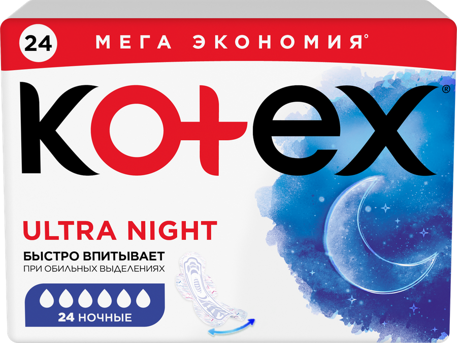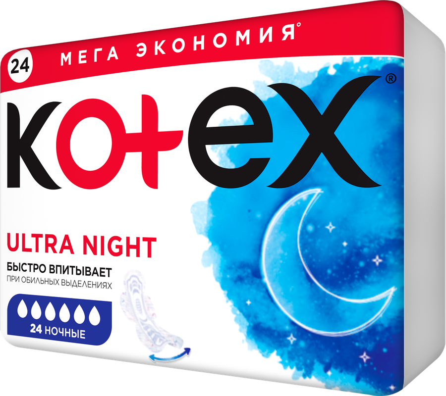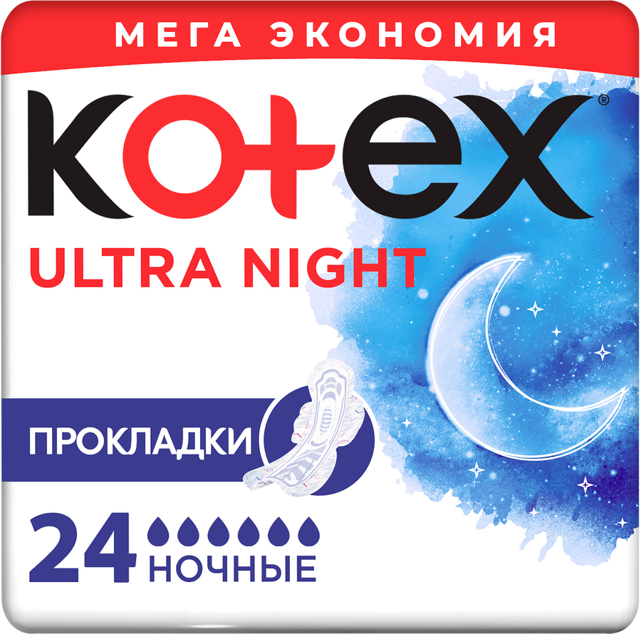 Прокладки KOTEX Ultra Night для обильных выделений во время сна. Улучшенная защита и новый стильный дизайн. Обеспечивают комфорт и уверенность до 100% ночью. Прокладка стала более гибкой, чтобы лучше подстраиваться под анатомию твоего тела и защищать от протеканий. Быстро впитывают при обильных выделениях лучшая защита от KOTEX, чтобы чувствовать себя комфортно ночью. Уникальный 3d центр – быстро впитывает. Эластичные желобки – придают прокладке гибкость для защиты от протеканий сзади. Подстраивающийся внутренний слой – адаптируется под анатомию твоего тела. Покрытие мягкая сеточка для максимального комфорта и сухости кожи. Специальная форма ночной прокладки для надежной защиты во время сна. Длиннее сзади. Мягкие крылышки, надежно крепятся к белью и не натирают кожу. Обновленный дизайн упаковки – стильный и современный.
