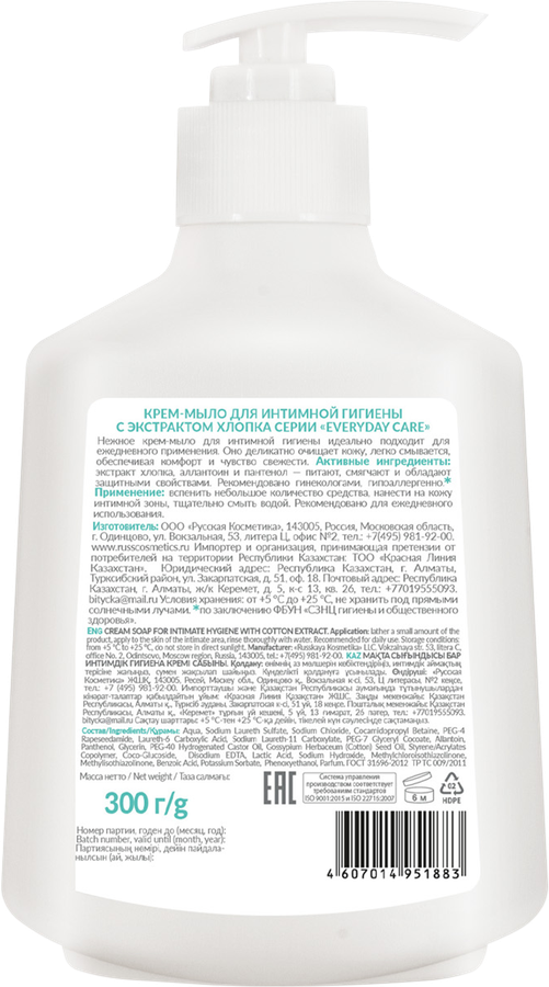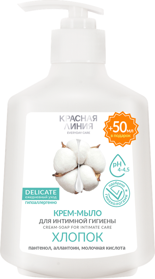 Жидкое мыло для интимной гигиены КРАСНАЯ ЛИНИЯ с экстрактом хлопка обеспечивает правильную интимную гигиену. А это залог здоровья, комфорта и отличного настроения в течение дня. Гипоаллергенное жидкое мыло с экстрактом хлопка прекрасно очищает, смягчает и успокаивает. Подходит для чувствительной кожи. Одобрено гинекологами.