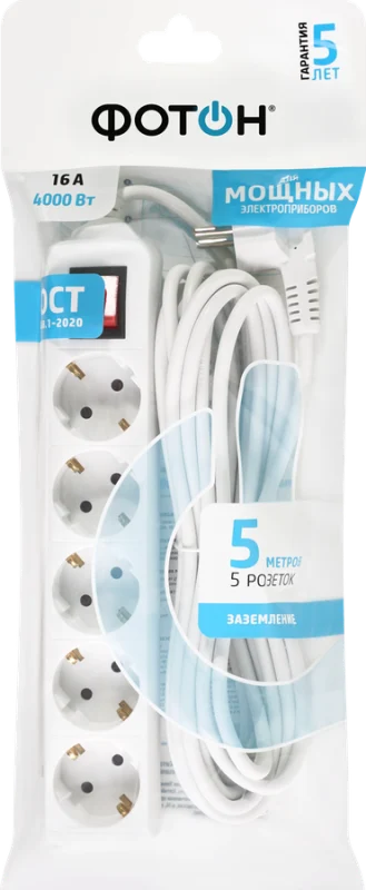 Сетевой фильтр ФОТОН с заземлением и выключателем характеризуется устойчивостью к нагреву и повышенной гибкостью. Гнездовые контакты расположены под углом для одновременного подключения нескольких приборов. Подходят для штепсельных вилок российского и европейского стандартов. Удлинитель рассчитан на одновременное подключение устройств суммарной мощностью до 3250Вт. Длина кабеля: 5м.
