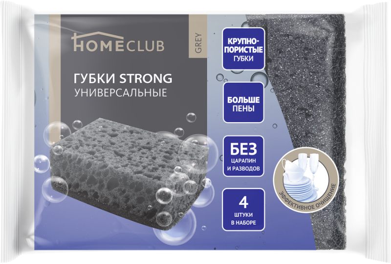 Губки для посуды HOMECLUB Grey Strong 9х6х3см, крупнопористые, 4шт