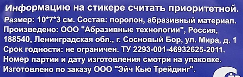 Размер губки: 10х7х3 см. Поролон крупнопористый 22 г/м3, абразивное полотно 500 г/м2.