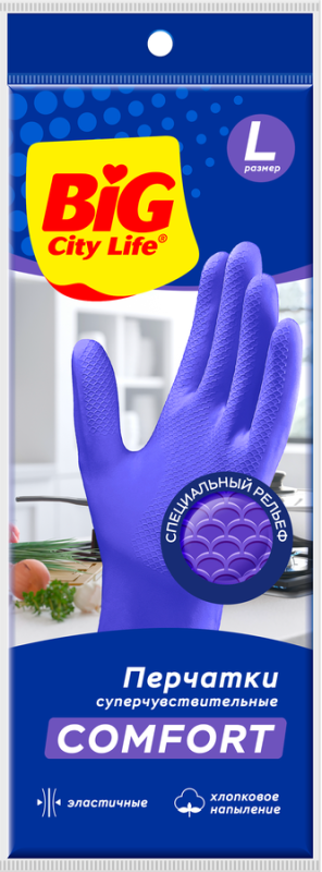 Суперчувствительные латексные перчатки от бренда BIG CITY LIFE – незаменимые помощники для хозяйки в процессе уборки и стирки. Перчатки изготовлены из натурального высококачественного латекса. Специально подобранная толщина перчаток позволяет хорошо чувствовать поверхности и мелкие предметы. Хлопковое напыление внутри надежно защищает руки от раздражения. Внешняя рельефная сторона в области пальцев и ладошки обеспечивает уверенный захват и фиксацию скользких предметов. Перчатки легко одеваются и снимаются, не скатываются. Яркий привлекательный дизайн и фиолетовый цвет перчаток создают хорошее настроение и помогают достичь отличного результата. Размер L подходит для мужских рук, размерная сетка есть на обработанной стороне упаковки. С перчатками BIG City Life максимальная защита и комфорт!