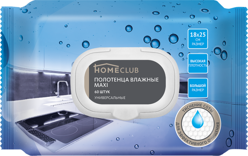 Полотенца влажные HOMECLUB Maxi 18х25см, универсальные, с тиснением соты, 60шт