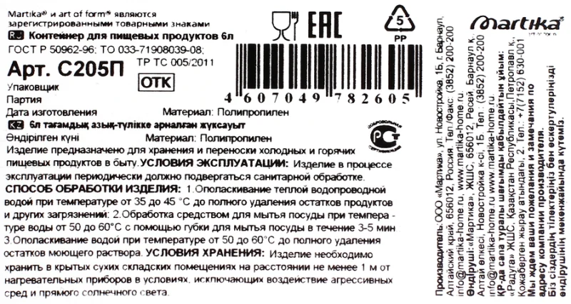Контейнер для пищевых продуктов MARTIKA 6л Арт. С 205П, 6л