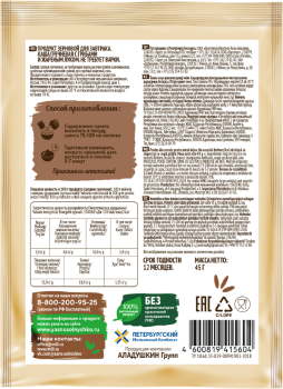 Хлопья гречневые, не требующие варки, кусочки грибов шампиньонов, сушенных сублимационной сушкой, лук сушеный жареный, соль.
