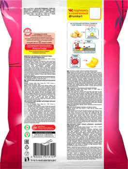 Картофель, специально приготовленный, масла растительные (подсолнечное, соевое), приправа (соль, пахта, пряности (паприка, перецкрасный чили), овощи сушеные (лук, чеснок), дрожжевой экстракт, регулятор кислотности – диацетат натрия, ароматизаторы натуральные,масло растительное, агенты антислеживающие – ортофосфат кальция 3-замещенный, диоксид кремния аморфный, ароматизатор, краситель –экстракт паприки, экстракт базилика, крупа пшеничная).