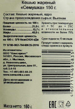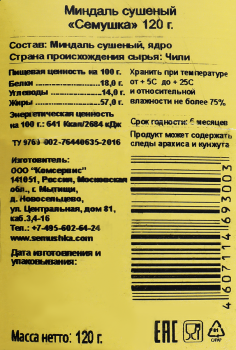 Изюм (виноград сушеный, подсолнечное масло, консервант Е220), жареные ядра орехов миндаля, фундука, кешью.