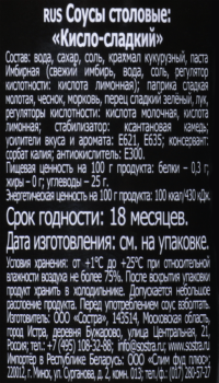 Соус SEN SOY Кисло-сладкий, 260г260 г113,80 ₽вода, сахар, соль, крахмал кукурузный, паста Имбирная (свежий имбирь, вода, соль, регулятор кислотности: кислота лимонная); перецсладкий красный, морковь, чеснок, лук, перец сладкий зеленый, регуляторы кислотности: кислота уксусная, кислота лимонная;стабилизатор: ксантановая камедь; усилитель вкуса и аромата: Е621; консерванты: бензоат натрия, сорбат калия; антиокислитель:изоаскорбат натрия 113,80 ₽0